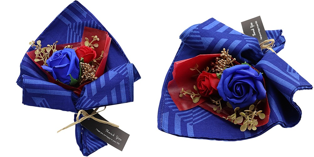以球队颜色为灵感,使用由日比谷花坛制作的香皂花制作迷你花束,并用手帕包裹进行装饰。