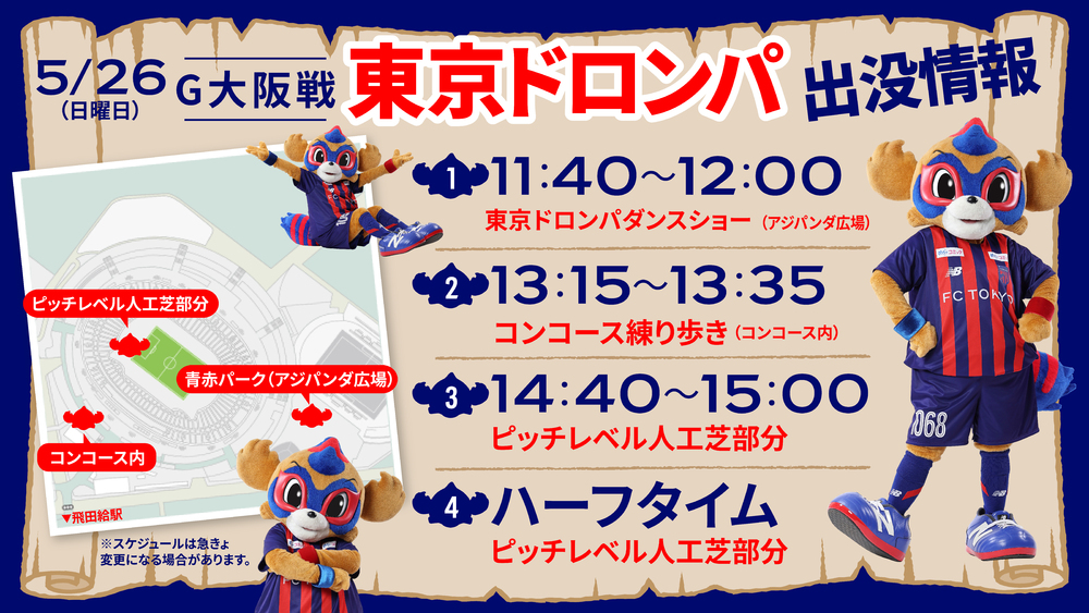 5月26日(周日) 2024明治安田J1联赛 第16轮 vs Gamba大阪(15:00开球/味之素体育馆)中,TOKYO DOROMPA将如以下所示出现。