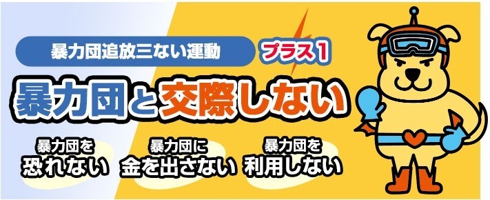 东京都为了实现“安全安心的东京城市”,正在推进“排除暴力团三不运动+1”。这三不运动是“不畏惧暴力团”“不向暴力团送钱”“不利用暴力团”,再加上“不与暴力团交往”,作为排除暴力团的基本理念。如果企业和居民能够切实践行这三不运动+1,暴力团将从社会中消失。恳请大家理解并协助配合。
