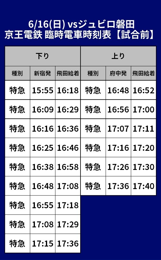 6月16日(周日) 2024明治安田J1联赛 第18轮 vsJúbilo磐田(18:00开球/味之素体育馆)将提供的临时交通接驳(铁路)、穿梭巴士及线路巴士的相关信息。