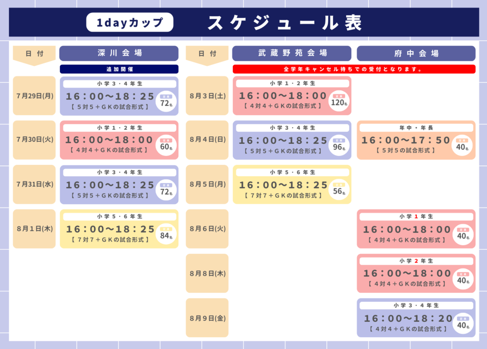 针对从全年龄段到小学6年级的儿童,我们将在暑假期间举办“1day杯”,以进一步提高足球技术。