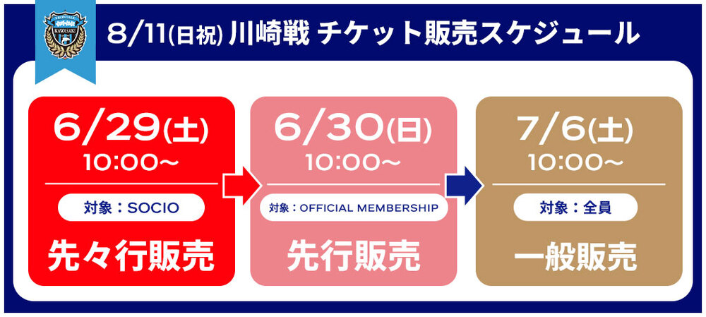 仅限SOCIO/OFFICIAL MEMBERSHIP会员,于8月11日(周日祝)川崎Frontale比赛首日以会员价格购买最多4张票的各位