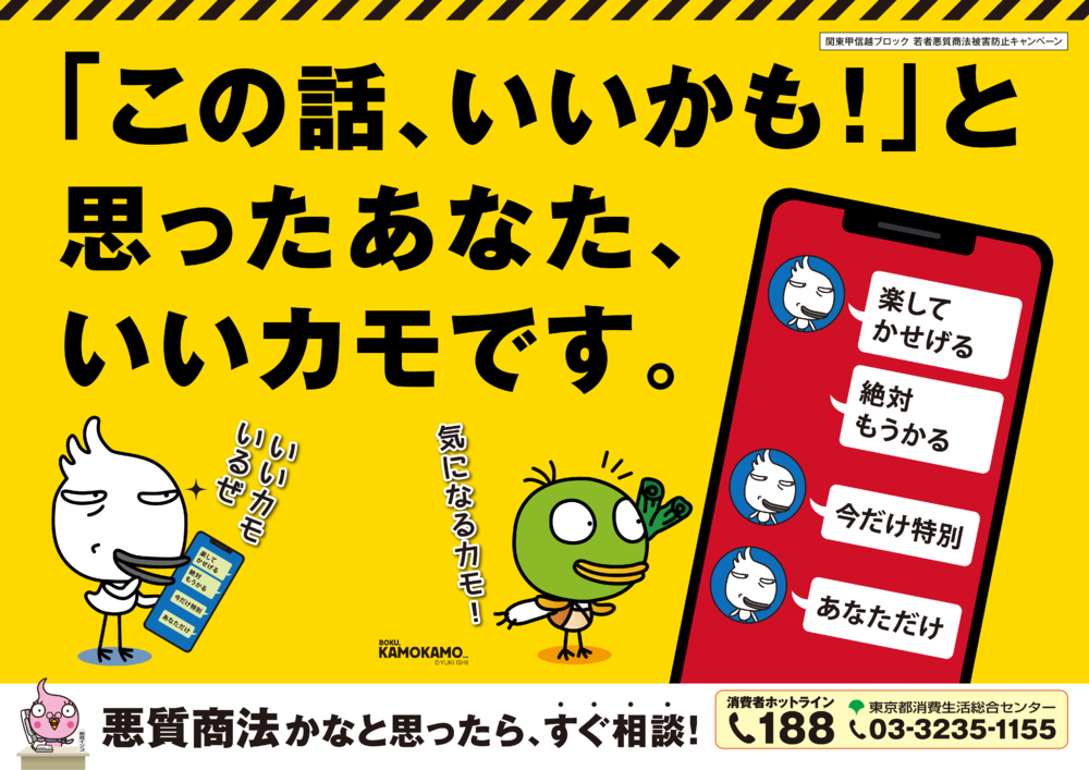 东京都通过涵盖“针对年轻人的恶劣商业行为防范”的东京都生活相关信息网站“东京生活Web”,开展防止市民消费者受害及扩大化的宣传活动。如遇纠纷或感到可疑,请拨打“消费者热线”电话188(无区号)咨询。