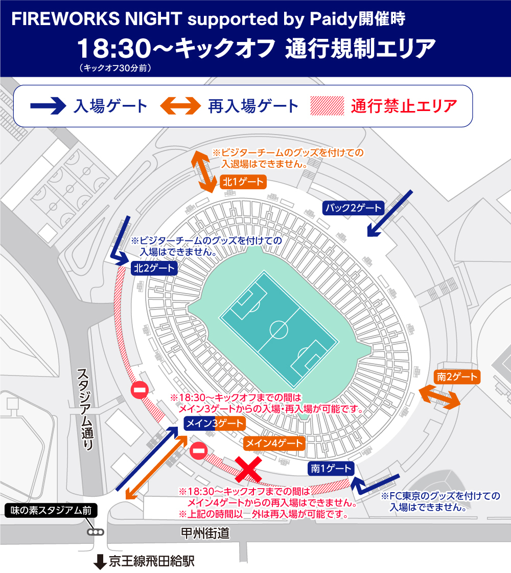 由于举办“FIREWORKS NIGHT supported by Paidy”的演出,重新入场的闸口将有所变更。此外,在部分时间段内,主看台外的场外通道将设有禁止通行区域,请注意。