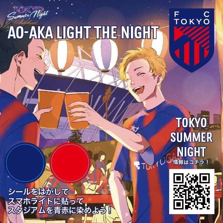 TOKYO SUMMER NIGHT活动的一部分,8月11日(周日祝) 2024明治安田J1联赛第26轮对阵川崎Frontale比赛(19:00开球/味之素体育馆)将向前来观赛的前20,000名观众发放『AO-AKA LIGHT THE NIGHT』贴纸。