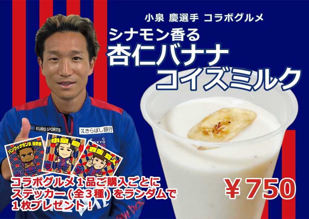 ・10月5日(周六)Sagan鸟栖战开始,将在“FC TOKYO FOOD FACTORY”销售小泉庆选手合作美食“肉桂香杏仁香蕉小泉牛奶”。
