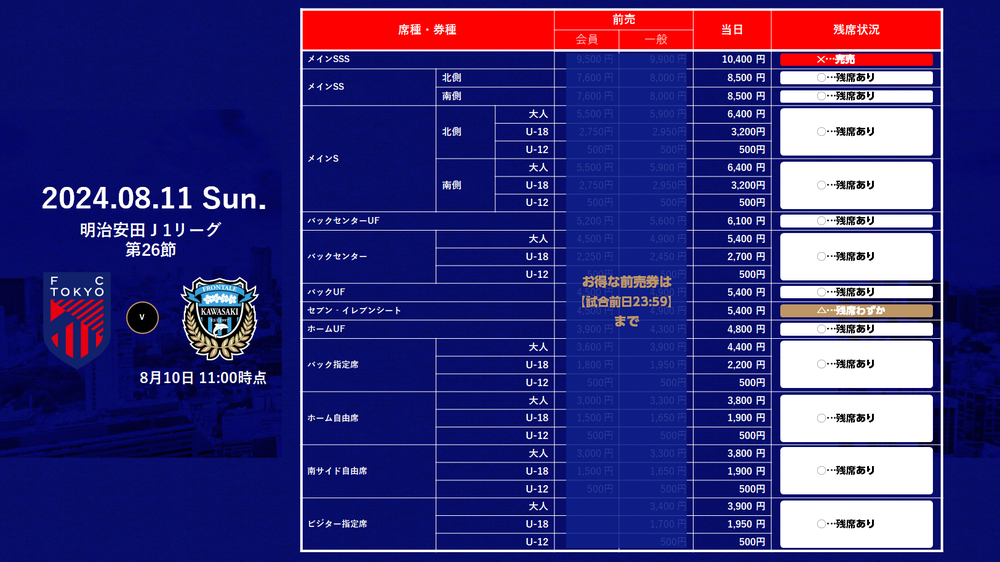 2024明治安田 J1联赛 第26轮 FC东京 vs 川崎Frontale(19:00开球/味之素体育馆)当天门票销售通知如下。