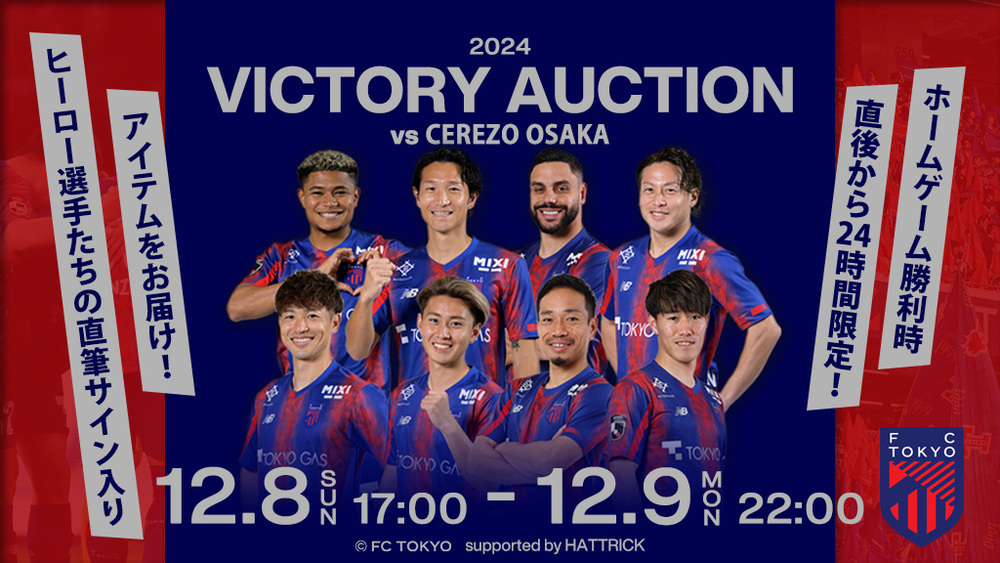 2024年9月14日(周六)明治安田J1联赛第30轮 vs 名古屋Grampus(19:00开球/日本国立体育场)的比赛中,将在拍卖服务HATTRICK(帽子戏法)举办胜利比赛后限时24小时的“胜利拍卖”。在目标比赛中实际使用的官方比赛用球等特别物品上,附上在该比赛中表现出色的球员亲笔签名和日期,送达给所有球迷和支持者们。