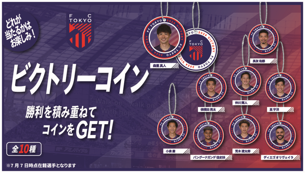 2024赛季,主场比赛中,胜利比赛后,在主场各商品售卖点购买FC东京商品满2,000日元(含税)以上,即赠送1枚胜利硬币!!