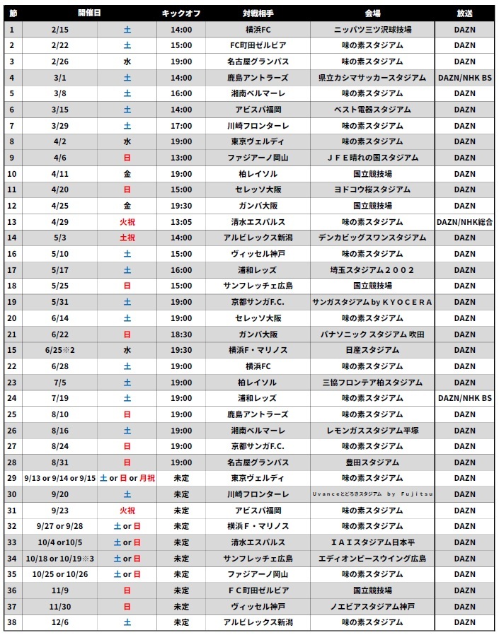 第15轮 客场 横滨FMarinos 战已确定为6月25日(周三)。