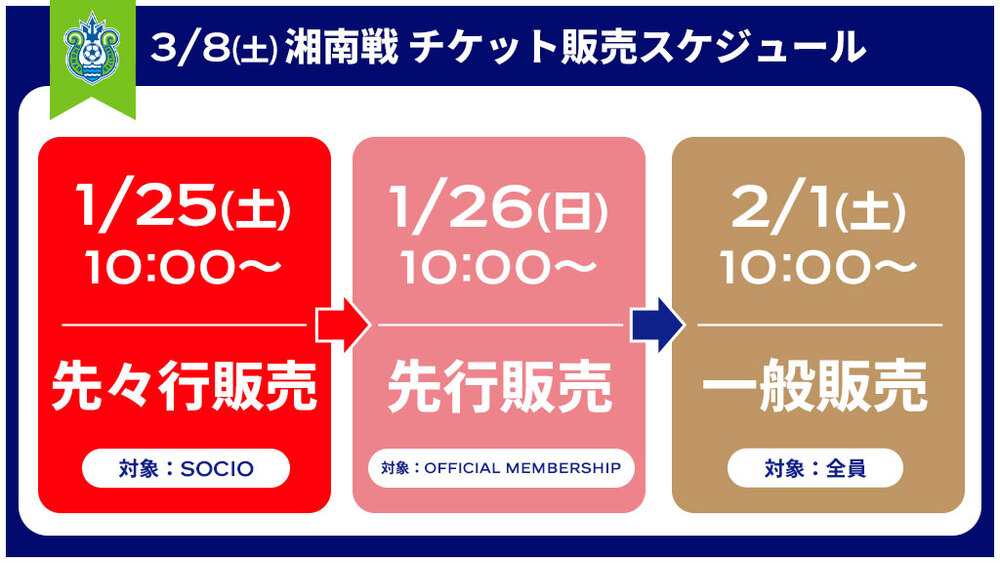 2025年3月8日(周六)明治安田J1联赛 第5轮 vs湘南Bellmare(16:00开球/味之素体育馆)的门票销售通知。