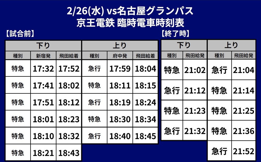 2月26日(周三) 2025明治安田J1联赛 第3轮 vs名古屋Grampus(19:00开球/味之素体育馆)将提供的临时交通接驳(铁路)、穿梭巴士及线路巴士的相关信息。