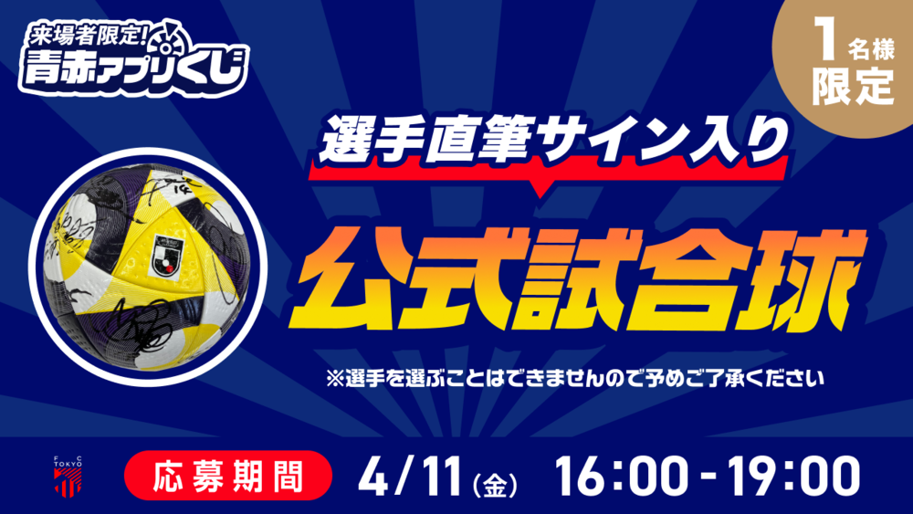 4月11日(周五)FC东京vs 柏太Reysol,将举办仅限来场者使用FC官方应用的“青赤应用抽奖”活动。