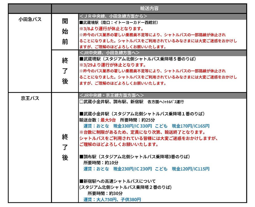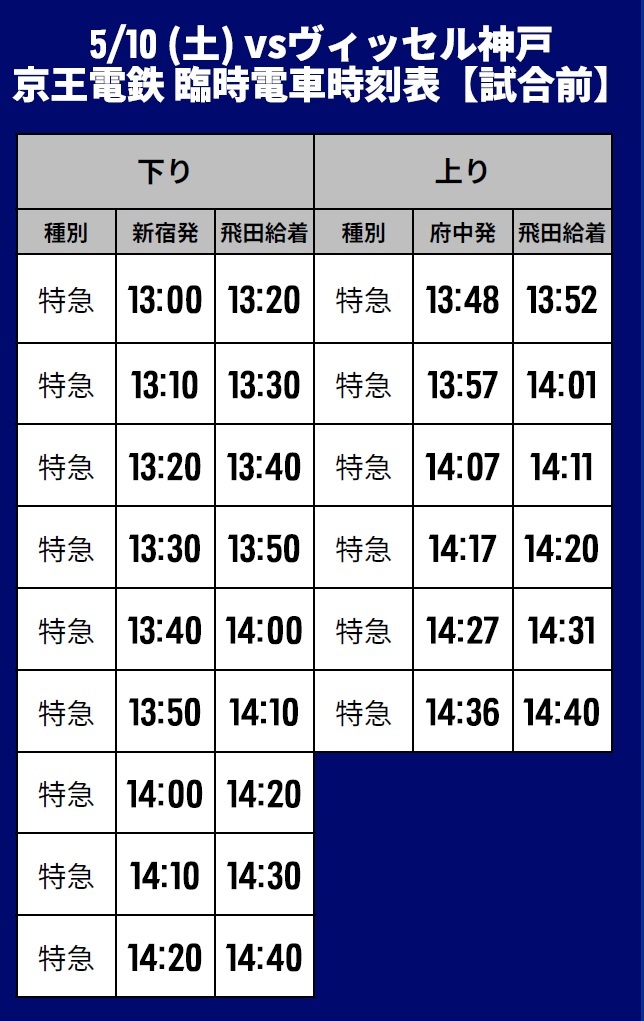 5月10日(周六) 2025明治安田J1联赛 第16轮 vs Vissel神户(15:00开球/味之素体育馆)将提供的临时交通接驳(铁路)、穿梭巴士及线路巴士的相关信息。
