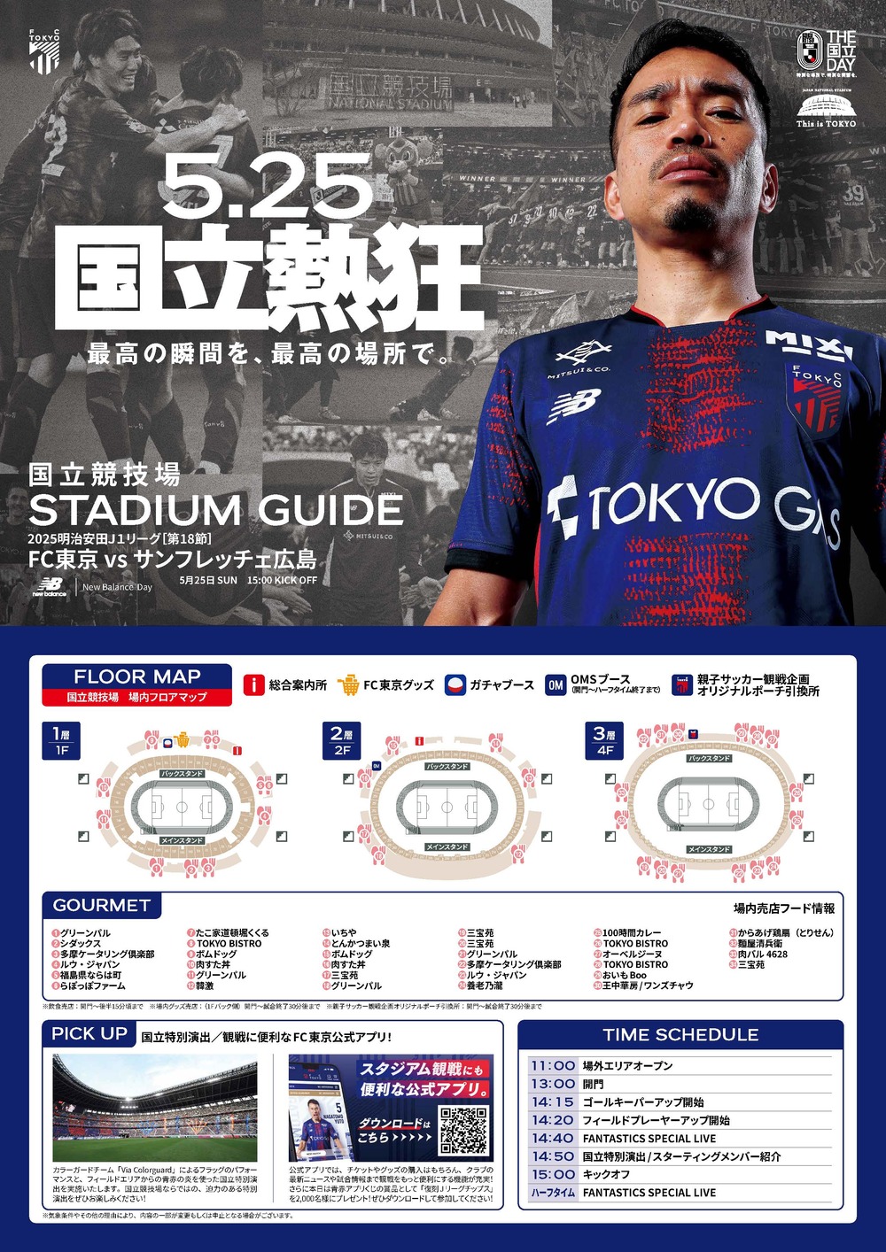 2025.5.23[比赛信息] 5/25(周日) 广岛战 日本国立体育场地图 5月25日(周日) 2025明治安田J1联赛 第18轮 vs Sanfrecce广岛(15:00开球/日本国立体育场)的体育场指南为您提供。 ◇活动详情请见这里◇饮食信息详情请见这里 ・体育场周边图 ※当天在会场分发的体育场地图上标有“肉山1号车”,但由于各种原因,该摊位已取消。“肉山1号车”位置将由“Sports BAR BASE RUNG”入驻,但分发的地图上未标注。对此造成的不便,敬请谅解,感谢您的理解与配合。 0525_Sanfrecce广岛_体育场地图.pdf