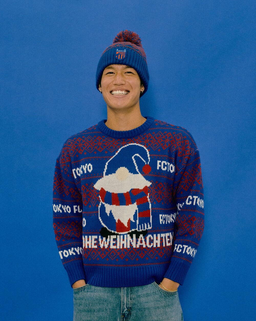 中央印有蓝红色的圣诞老人和德语FROHE WEIHNACHTEN(圣诞快乐)的FC东京原创丑毛衣,时尚还是土气,全看穿搭方式!?