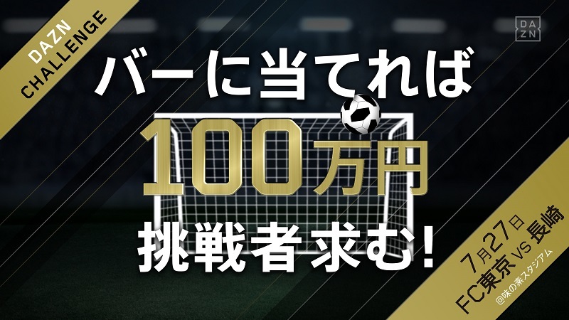 ※“DAZN挑战”是指从指定地点(禁区线)踢球,击中球门横梁(上部)即为成功。成功后可获得“100万日元”的超特别企划!