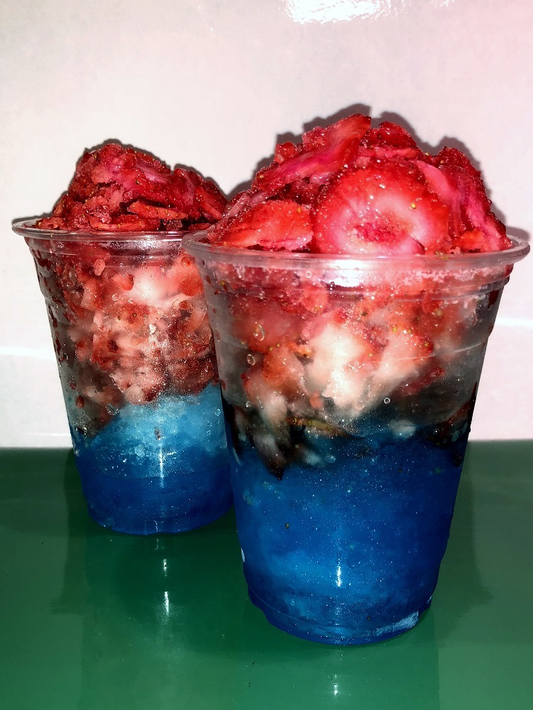 刨冰上淋上蓝色夏威夷糖浆,顶部放有红色刨冰草莓,是一款冰凉甜点!这是FC东京限定版本。