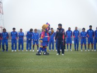 選手達と仲良く(?)戯れながら(?)グランドへと向かって行きました。監督の横で、今シーズンへの想いをきいて皆さんに一礼。