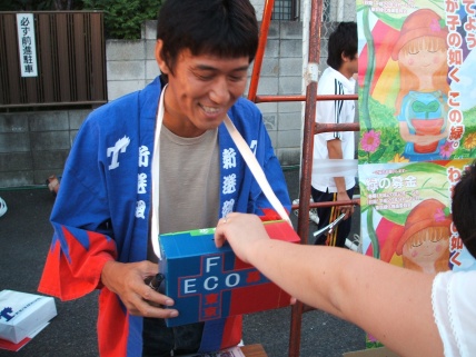 活動が終わってからは多少時間があり、焼き鳥や焼きそばを食べられたのでお祭りを満喫することもできました。この募金活動は今月も引き続き行なわれる予定です。FC東京のホームページなどでも告知をしていきますのでチェックしてください。お祭りに参加した際には、ぜひ募金もよろしくお願いします!!