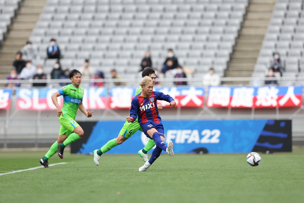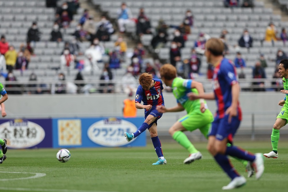 比賽一開始面對湘南銳利的出腳,稍微退守防守,但漸漸能夠開始移動球,穩紮穩打地將湘南球員壓進敵陣。上半場7分鐘時有快速反擊的絕佳機會。三田選手從左側突破,在禁區前射門,球碰到對方防守球員後彈出,永井選手撿到球並傳出倒三角傳中。東選手在門前正中央位置接球一觸射門,但射門未能命中目標。上半場9分鐘時,永井選手閃過對方防守球員的滑鏟,帶球加速直奔對方球門。進入禁區後,從門左前方位置用右腳繞射,但可惜射偏到門右側。接連製造機會後,東京掌握比賽節奏。面對全隊回防並固守防線的湘南,東京先寬幅移動球,尋找對方陣形的破綻。