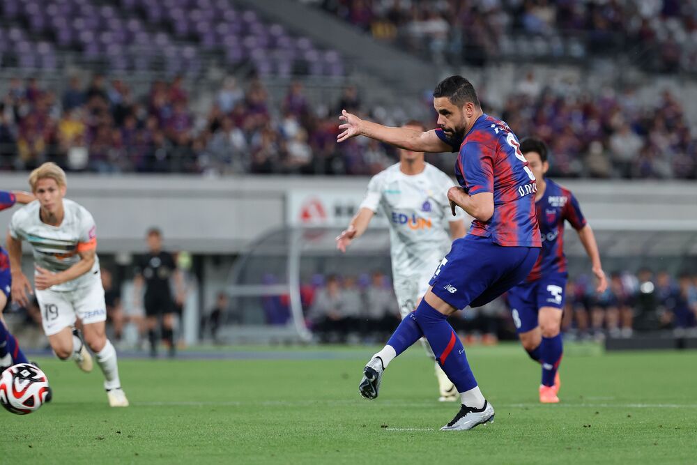 想要發起攻勢的東京隊在上半場25分鐘時,接到Henrique TREVISAN選手的縱向傳球的仲川選手在場中央轉身加速。帶球向前推進的同時,送出銳利的縱向直塞球,強勢突出的Diego OLIVEIRA選手在試圖晃過守門員時被犯規,獲得了點球。背號9如往常般以細膩的步伐晃過對方守門員,將球送入右下角,成功追回一分。