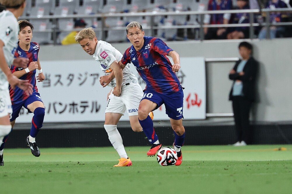 東京隊針對廣島隊前線的壓迫與回防時的防守陣型,靈活運用傳球配合與快速反擊掌控比賽節奏。上半場補時階段,從左側連續創造多次絕佳機會,但Thales選手的頭球與俵積田選手的射門皆未命中目標。以落後1分的劣勢進入中場休息。