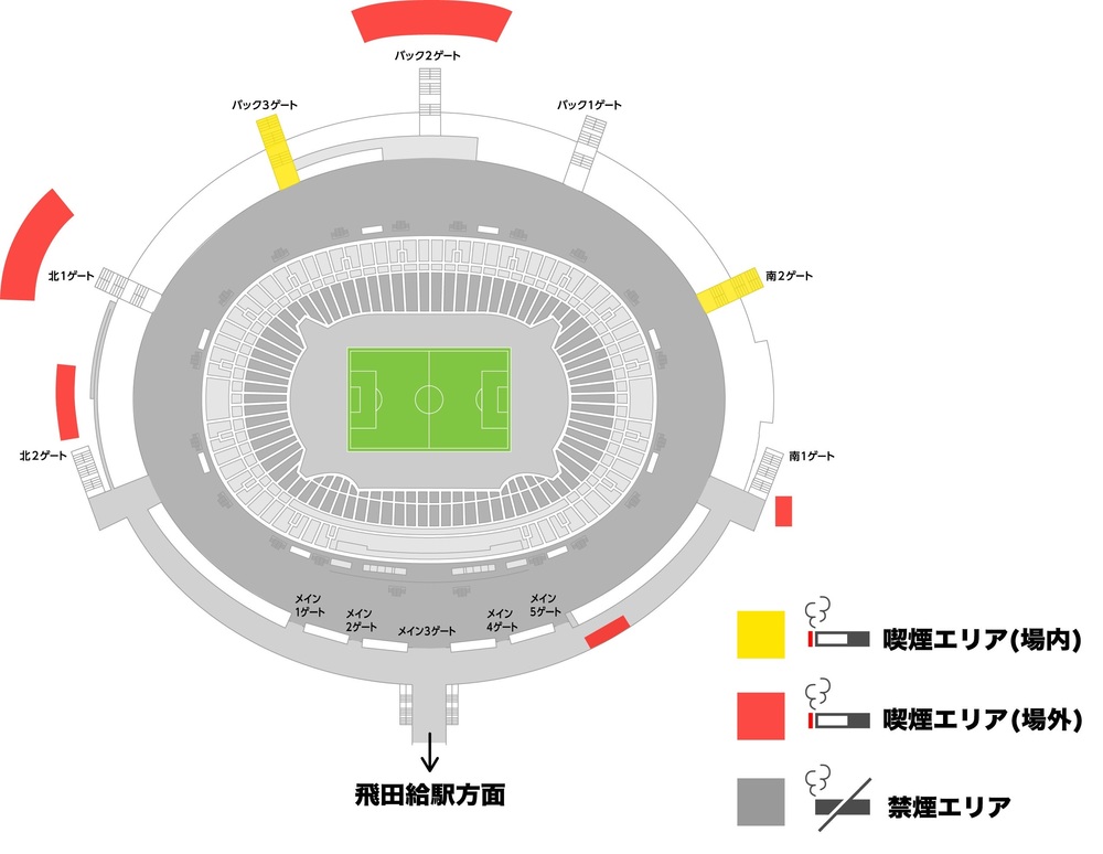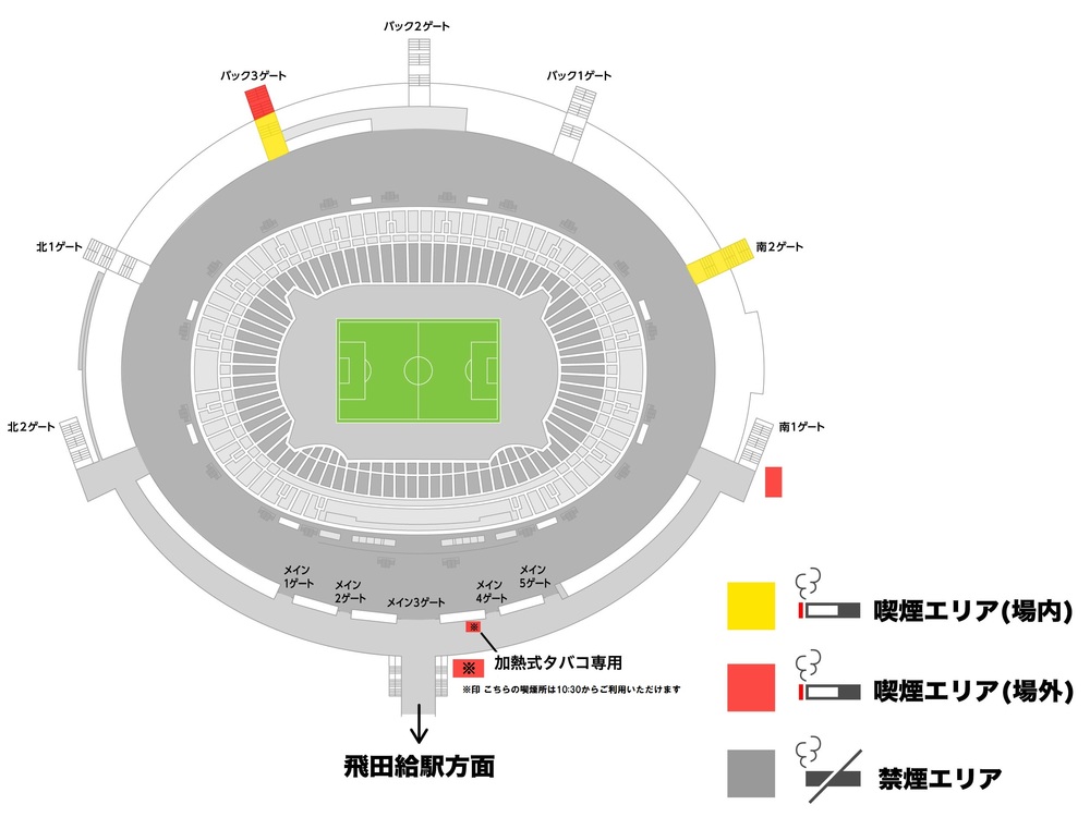 謹此通知,於味之素體育館舉辦的FC東京主場比賽中,吸煙區的位置將變更如下。關於過去收到許多意見的吸煙區,為了減少被動吸煙的機會,決定實施此變更。