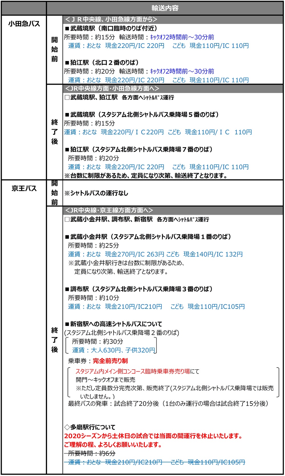 10/24(周六) 2020明治安田生命J1聯賽 第28節 vs橫濱FMarinos(15:00開球/味之素體育館)將提供接駁巴士及路線巴士的相關資訊。