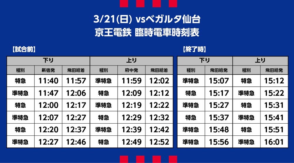 3月21日(周日) 2021明治安田生命J1聯賽 第6節 vs Vegalta仙台(13:00開球/味之素體育館)將提供臨時交通接駁(鐵路)的相關資訊。