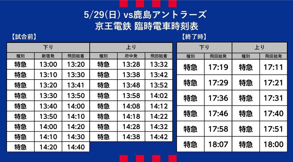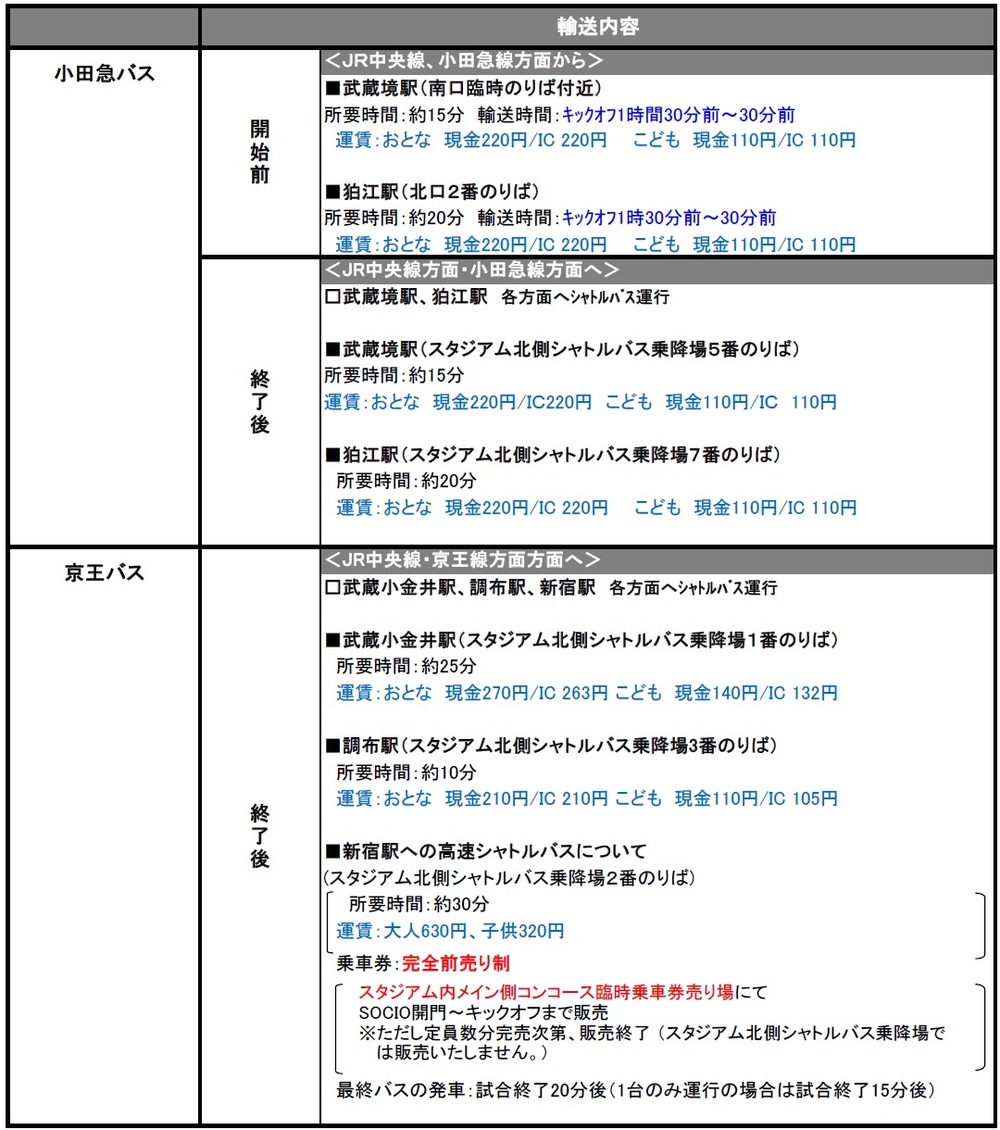 5月29日(周日) 2022明治安田生命J1聯賽 第16節 vs 鹿島Antlers(15:00開球/味之素體育館)將提供臨時交通接駁(鐵路)、接駁巴士及路線巴士的相關資訊。