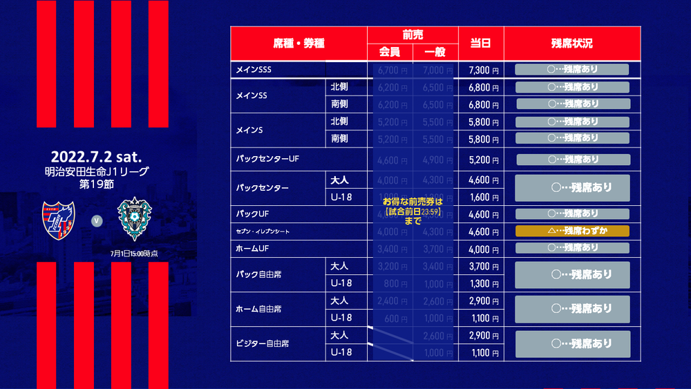 ※比賽當天不會在會場販售當日票。僅限於透過Ticket FC東京(J聯盟票券)販售。