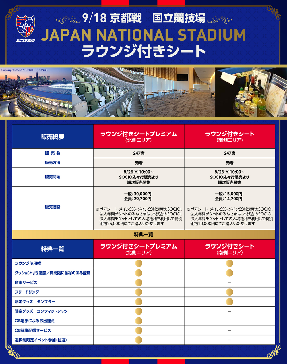 ※欲以特別價格購買雙人座・主看台SSS・主看台SS指定席的SOCIO會員,請選擇附設休息室的豪華座位或附設休息室的座位,並於「【FC東京】〔SSS0元/休息室優惠取得〕限雙人・主看台SSS會員兌換」或「【FC東京】〔SS0元/休息室優惠取得〕限主看台SS會員兌換」中,選擇您作為SOCIO購買的席別。