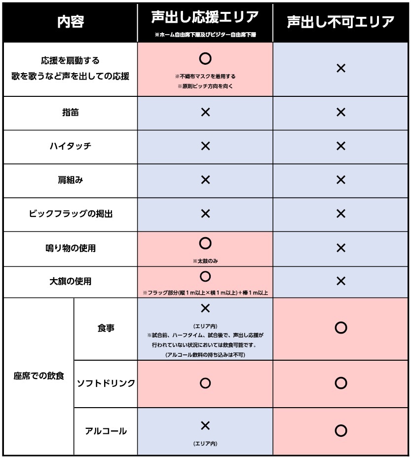 ・比賽前、半場休息、比賽後,在未進行喊聲應援的情況下,可以飲食(禁止攜帶酒精飲料)。即使是在比賽前、半場休息、比賽後,只要有喊聲應援的情況以及比賽進行中,仍然禁止飲食。(但除酒精飲料外,可補充水分)。