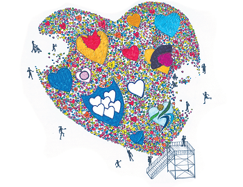 調布市作為推動共生社會的重要措施之一,自平成29年度起舉辦「調布市帕拉藝術展」,展示市內福祉作業所等場所成員的作品。今年度,作為「帕拉藝術展」的支援企劃,將實施任何人皆可參加的「大愛心計畫」。以「帕拉心調布」為主題,使用多彩的膠帶製作手掌大小的愛心,並將收集到的愛心連結起來,完成大型藝術作品。此計畫除了市內福祉團體外,還有FC東京的選手及與調布有淵源的藝術家等多領域人士參與。歡迎蒞臨的各位也親自體驗大型藝術創作的樂趣。