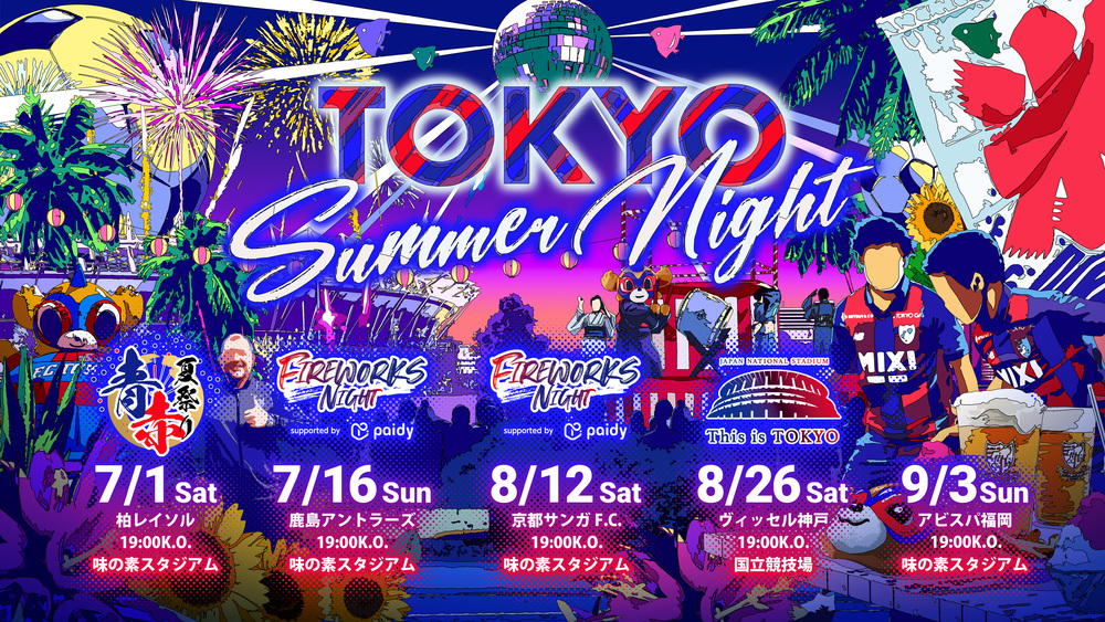 7月以後舉辦的5場主場夜間比賽,將以「2023 TOKYO SUMMER NIGHT」的名義舉行,讓您享受夏夜的足球觀賽。請盡情享受點綴體育場的煙火與燈光演出、音樂、美食、啤酒等,帶來最棒的夏夜活動體驗!