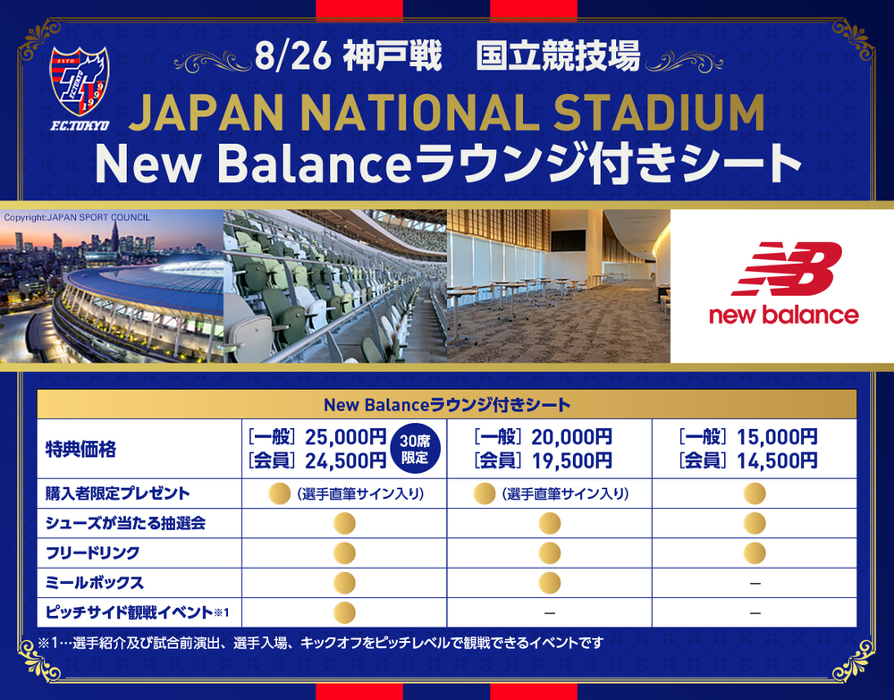 8月26日(周六) 2023明治安田生命J1聯賽 第25節 vs Vissel神戶(19:00開球/日本國立體育場)中,感謝俱樂部贊助商「株式会社ニューバランスジャパン」的協助,將販售附有New Balance休息室座位的票券。