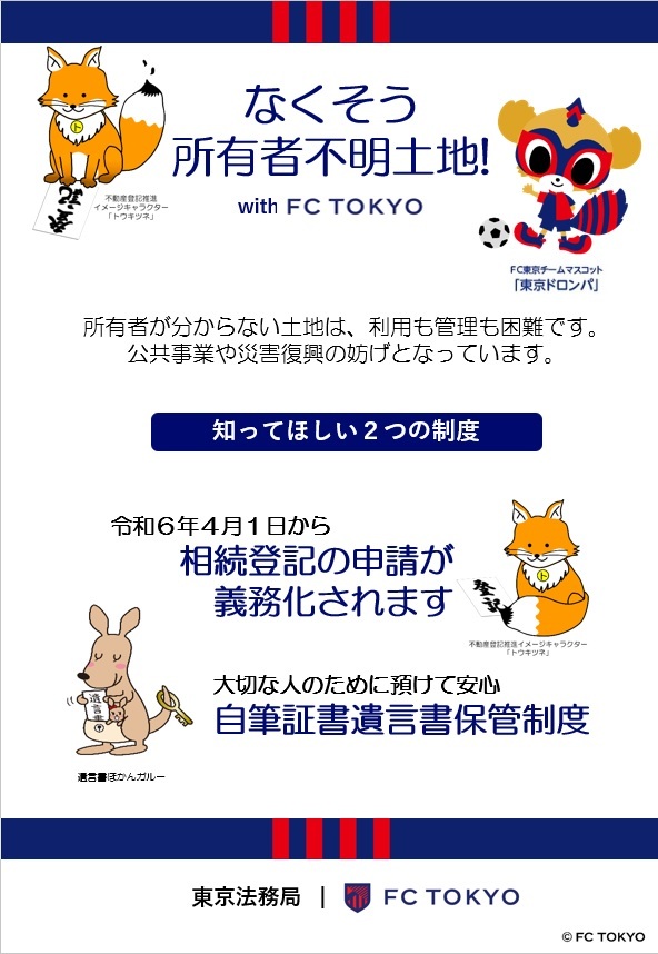 3月9日(周六) 2024明治安田J1聯賽 第3節 vs Vissel神戶(16:00開球/味之素體育館)中,將與東京法務局合作,協助推廣自2024年4月1日起施行的「繼承登記申請義務化」。