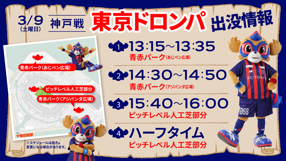 3月9日(周六) 2024明治安田J1聯賽 第3節 vs Vissel神戶 (16:00開球/味之素體育館) TOKYO DOROMPA將如以下所示登場。敬請期待!