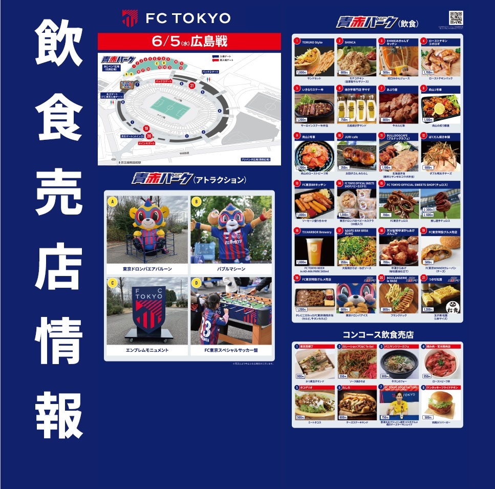6月5日(周三)Sanfrecce廣島戰的AO-AKA PARK(場外)、出張!!AO-AKA PARK、體育館內走廊(場內)販賣部販售的飲食資訊通知您。