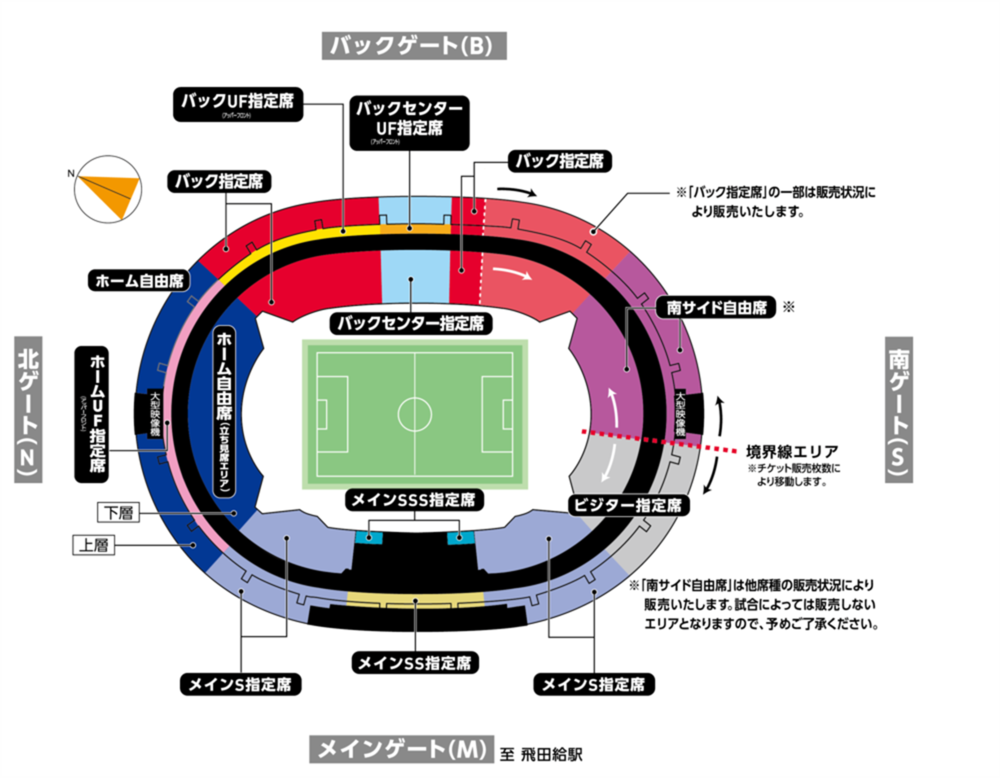 ※可穿戴訪客隊伍制服及商品,並為訪客隊伍加油的席位為上述「主看台SS指定席 南側」、「主看台S指定席 南側」、「訪客指定席」三種席位,其他席位皆為FC東京的應援席。