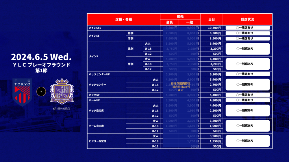 ※比賽當天不會在會場販售當日票。僅限於透過Ticket FC東京(J聯盟票券)販售。