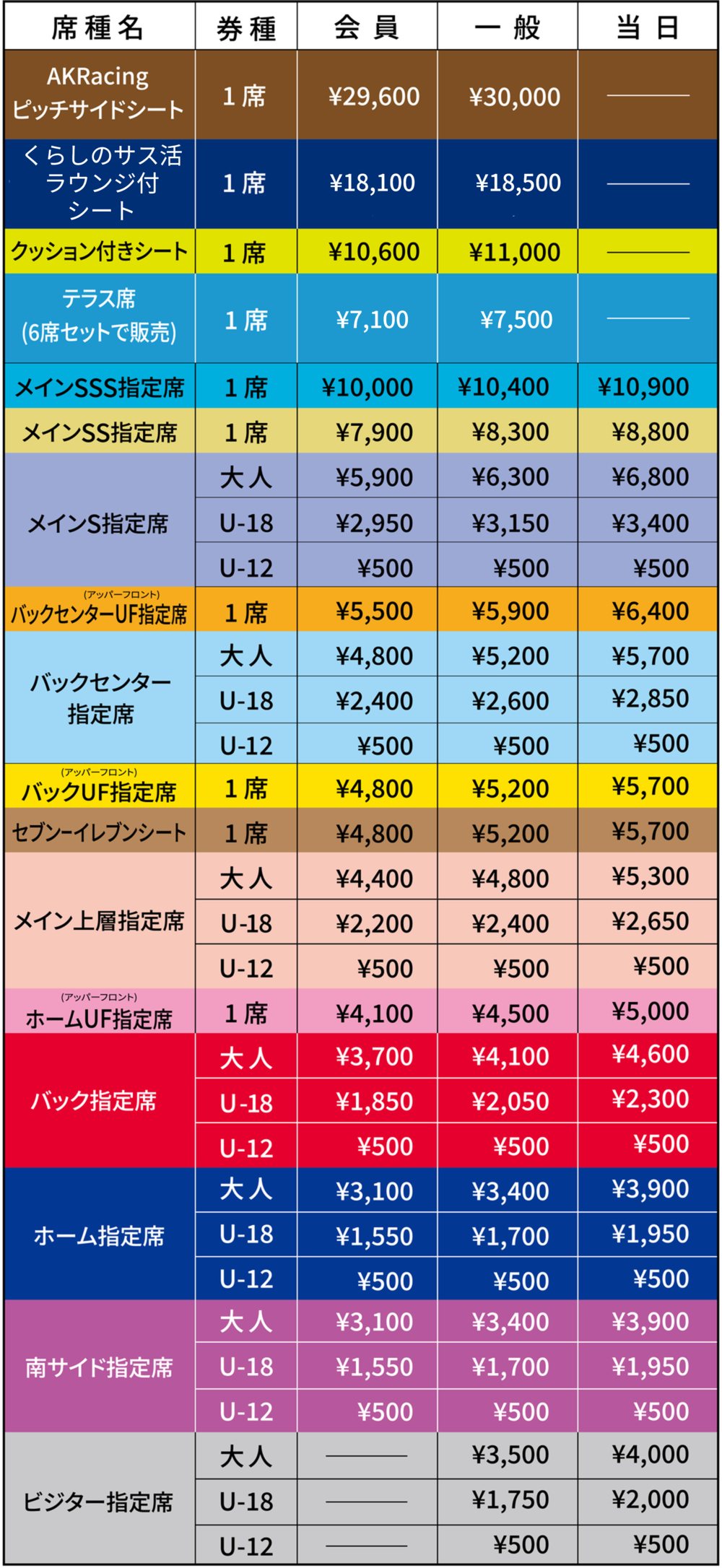 ※U-18票價適用於2006年4月2日以後出生者,U-12票價適用於2012年4月2日以後出生者。未就學兒童若坐在家長膝上觀賽,則無需購票。