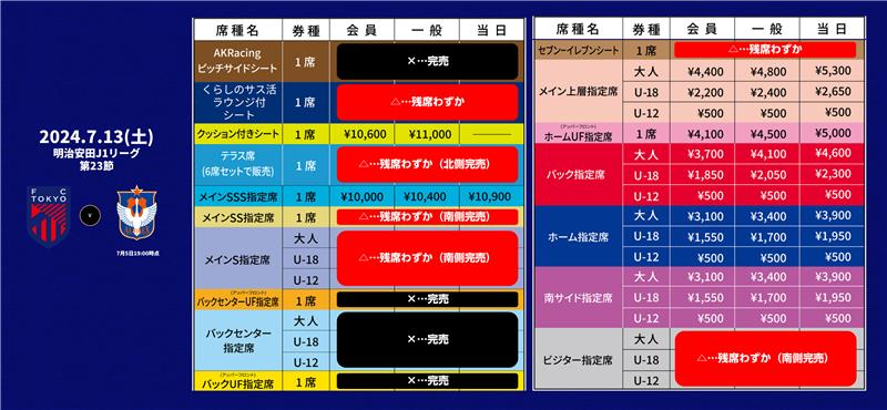 ※目前,即使票券FC東京的販售標示為「〇」,但並排座位的庫存數量已所剩無幾,若您正在考慮前來觀賽,建議盡早取得票券。