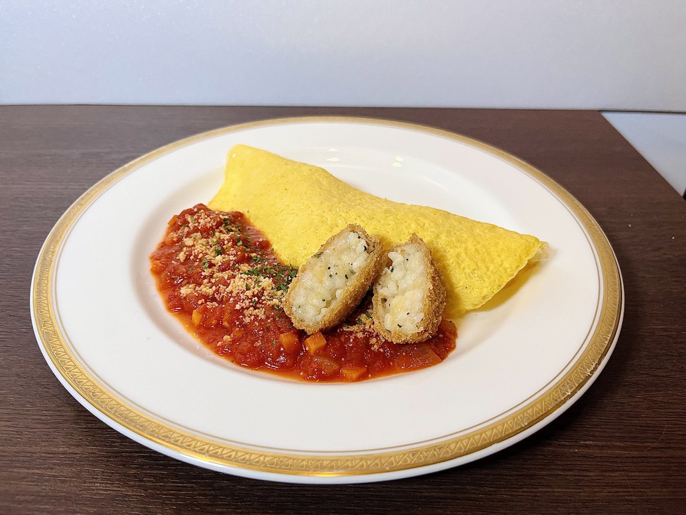 將起司燉飯的米飯可樂餅包裹在薄煎蛋中,並使用自製的番茄與羅勒醬,製作成佳史扶選手最喜愛的蛋包飯風味。