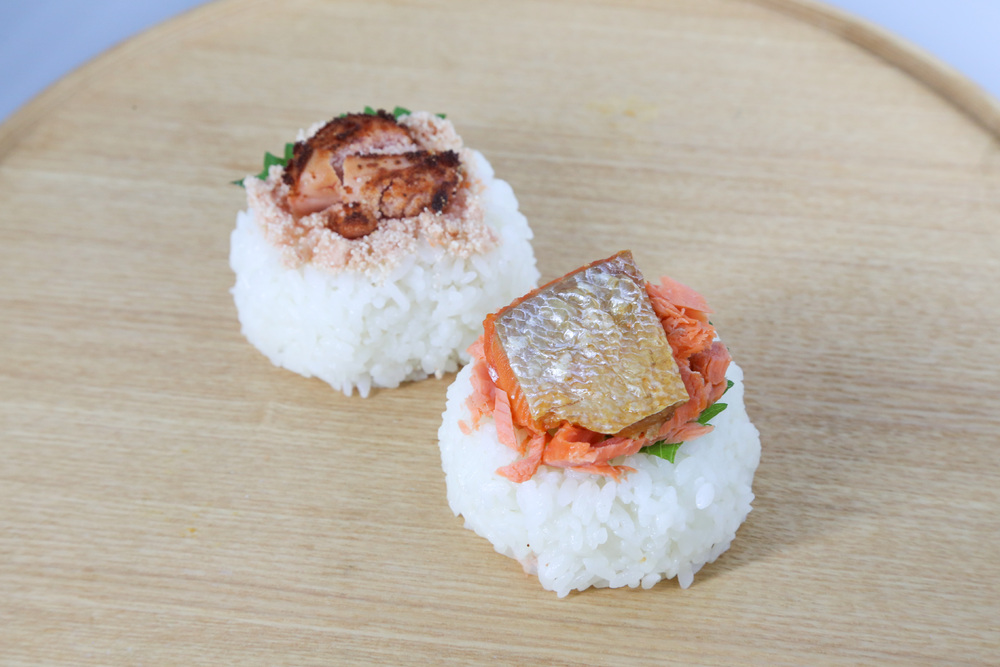請務必品嚐加入大葉、鮭魚鬆和鮭魚肚的講究飯糰。
