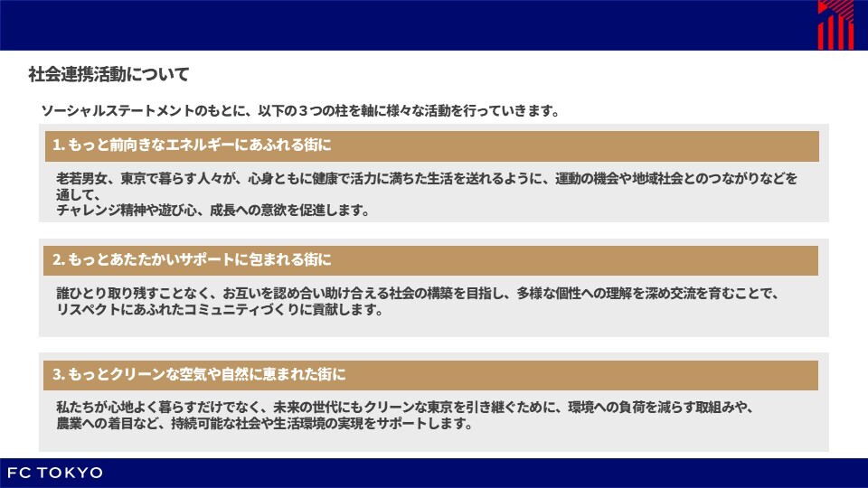 再次統一所有參與社會連結活動者的視角,並以相同的方向推進,重新整理FC東京社會連結活動的定位,特此作為「FC TOKYO 社會聲明」向大家傳達。