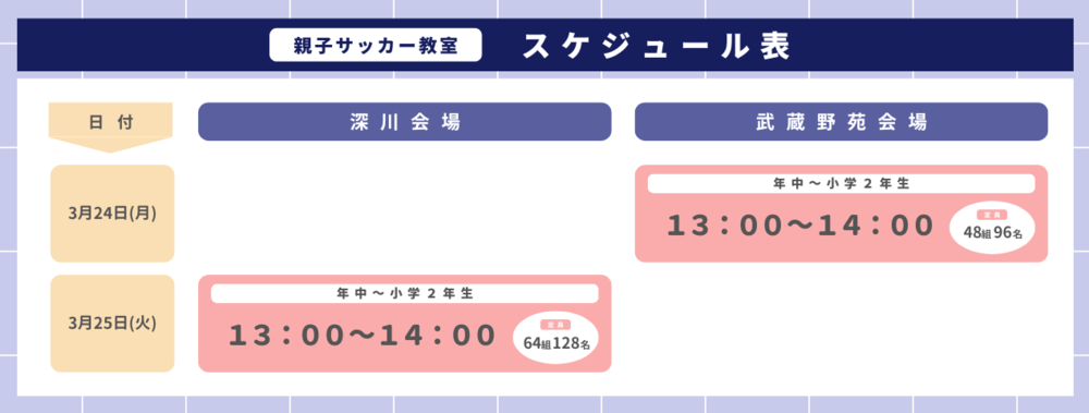 3月24日(周一)・25日(周二)將針對全年齡至小學2年級的兒童及其家長,舉辦由FC東京普及部教練主辦的「親子足球教室」。
