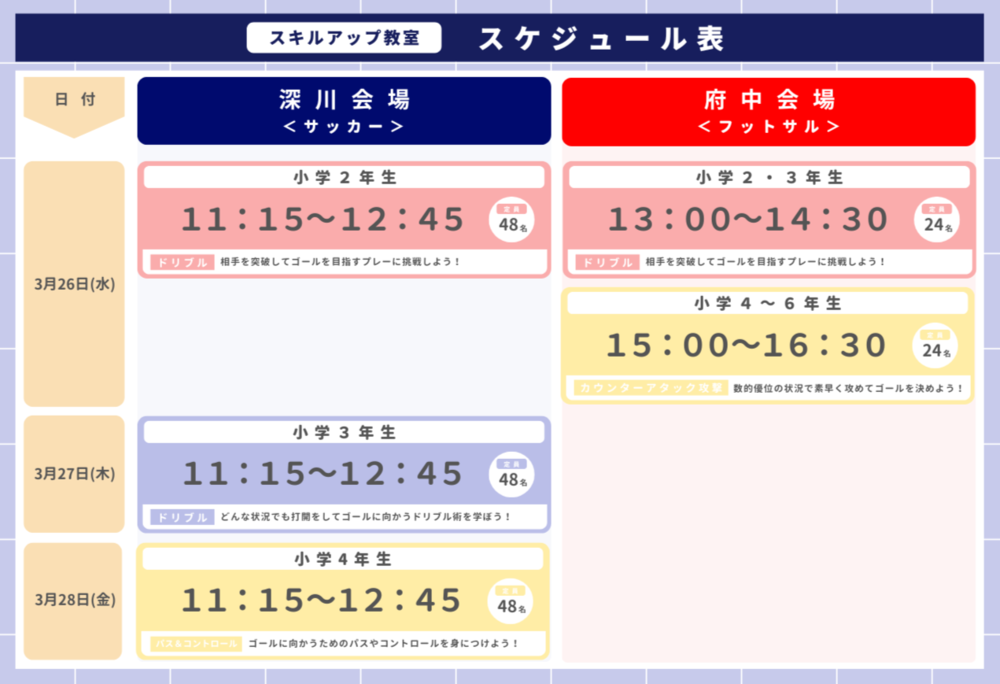 針對小學2年級到小學6年級的兒童,於春假期間舉辦「技能提升足球・室內五人制足球教室」,以提升足球及室內五人制足球的技術。