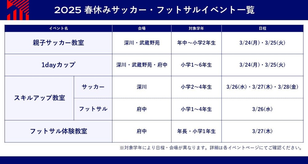 今年春假期間,FC東京將舉辦針對幼兒及小學生的各種活動。所有訓練營均由FC東京引以為傲的普及部教練團隊負責。